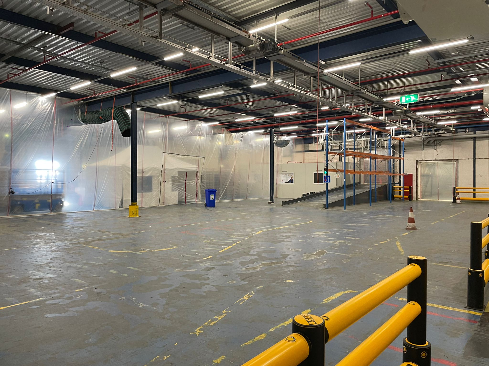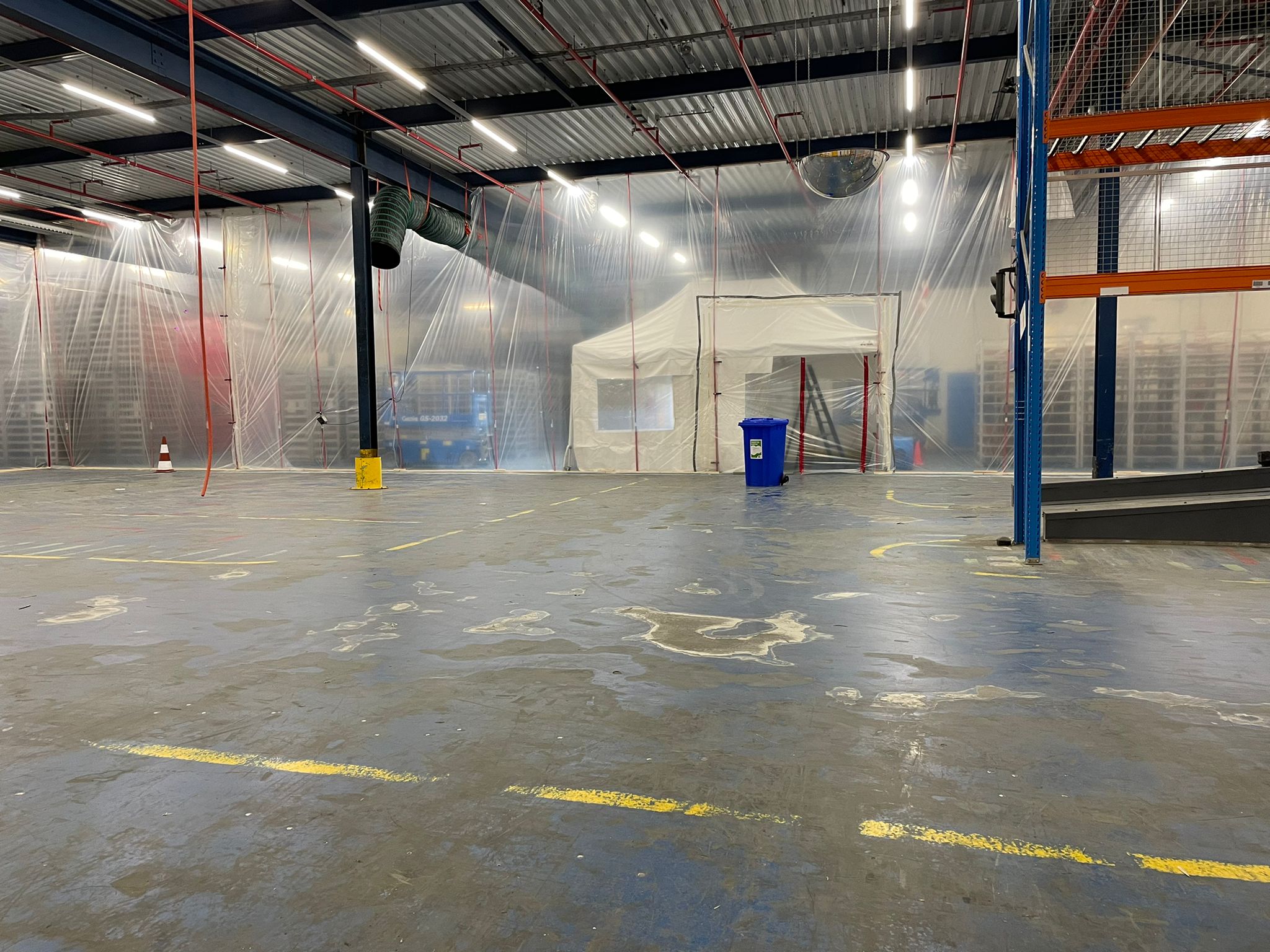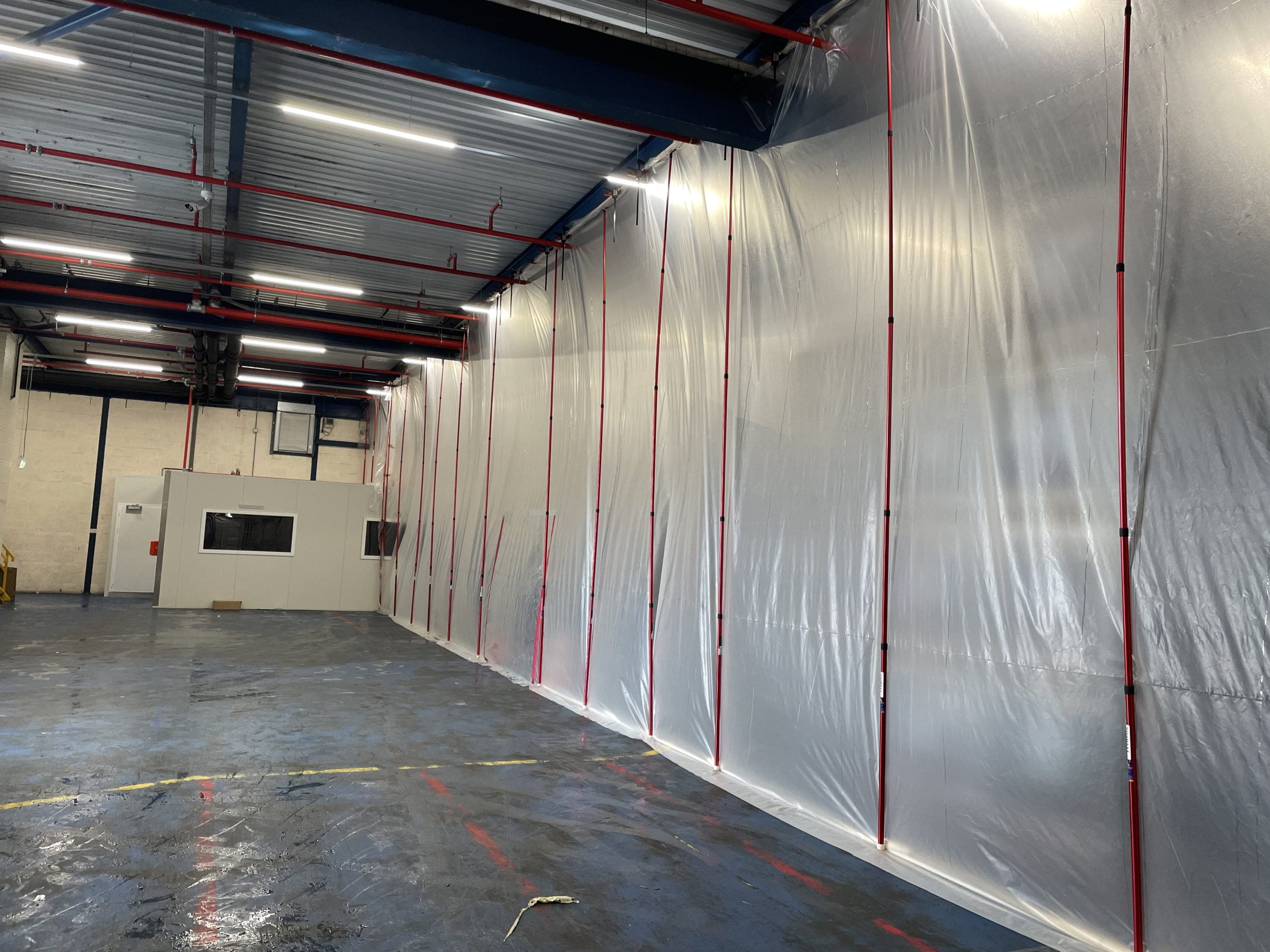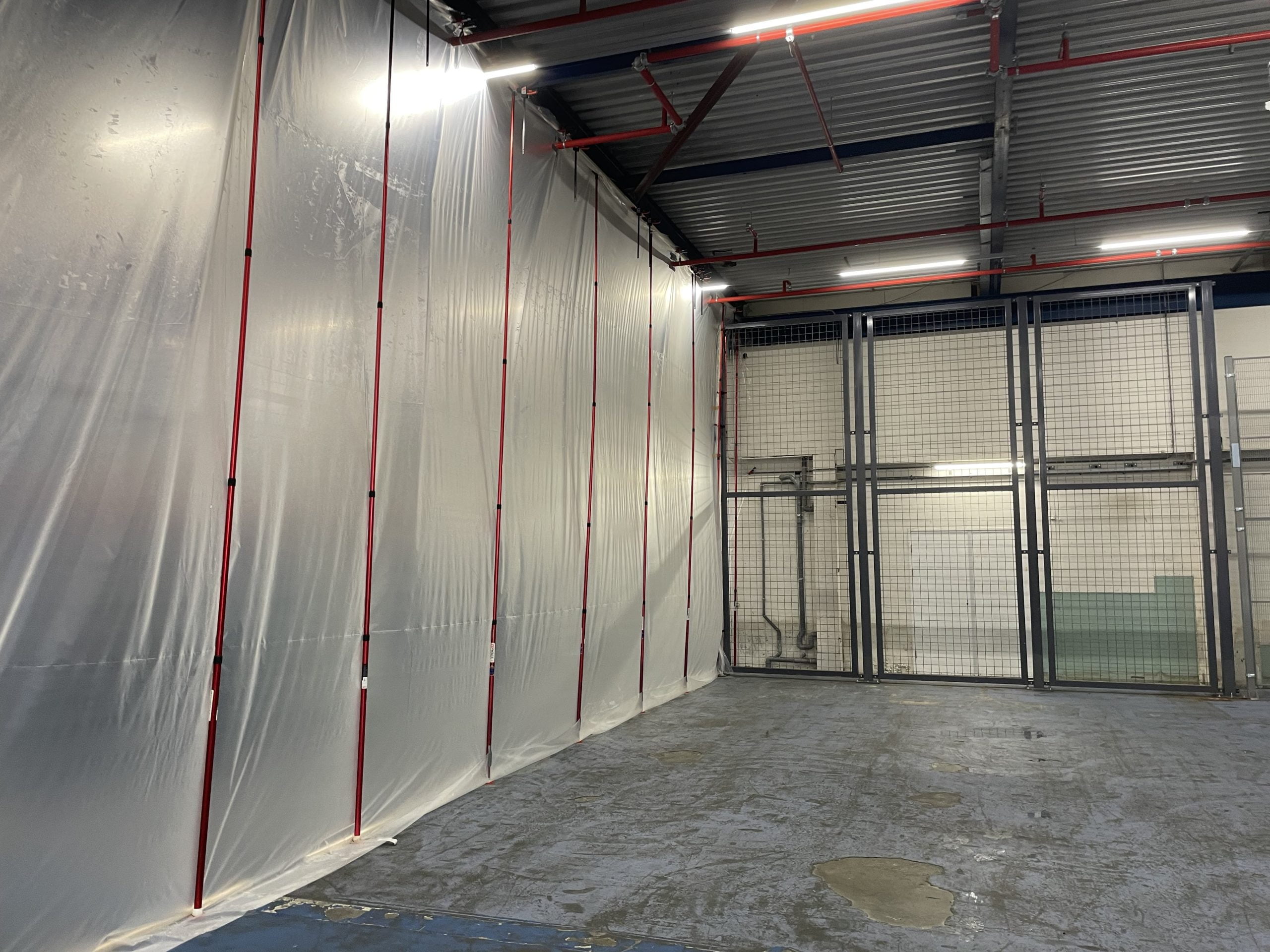 Staub und Lebensmittel passen nicht zusammen, deshalb durften wir während der Bodenrenovierung mehrere Staubschutzwände von 6 Metern Höhe installieren. Um den Produktionsprozess nicht zu sehr zu stören, wurde entschieden, den gesamten Boden in verschiedenen Phasen zu renovieren. Das ZipWall-System war ideal geeignet, da keine Zeit war, beispielsweise Holzstaubwände zu bauen. Der Aufbau solcher Wände dauert einfach zu lange und würde den Produktionsprozess zu stark beeinträchtigen. Das ZipWall-System lässt sich schnell und einfach bis zu einer Höhe von 6 Metern aufbauen.