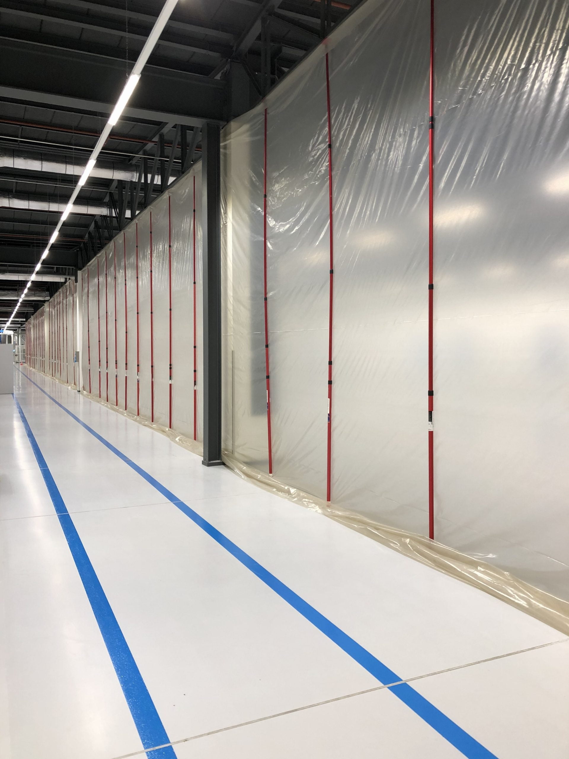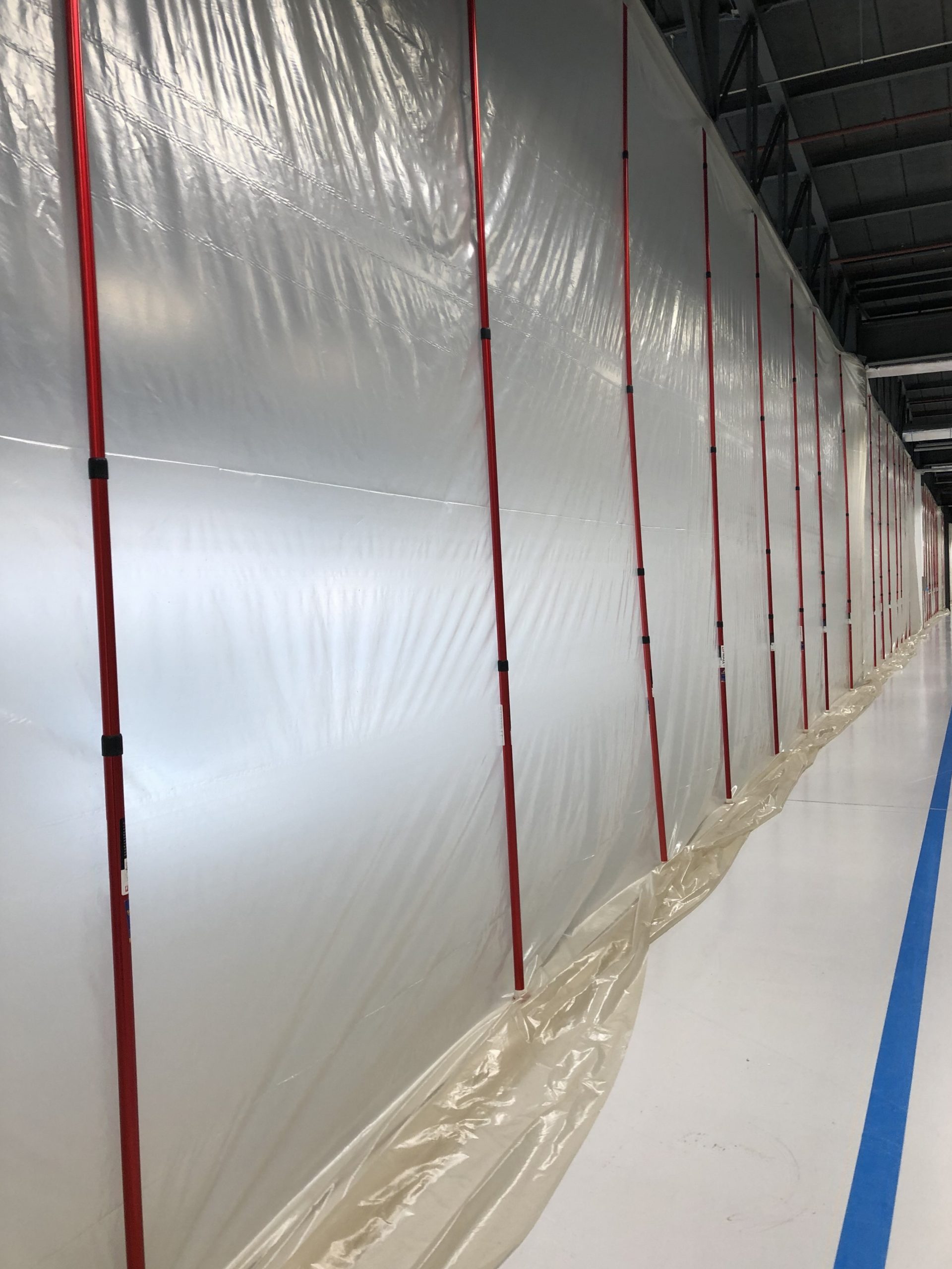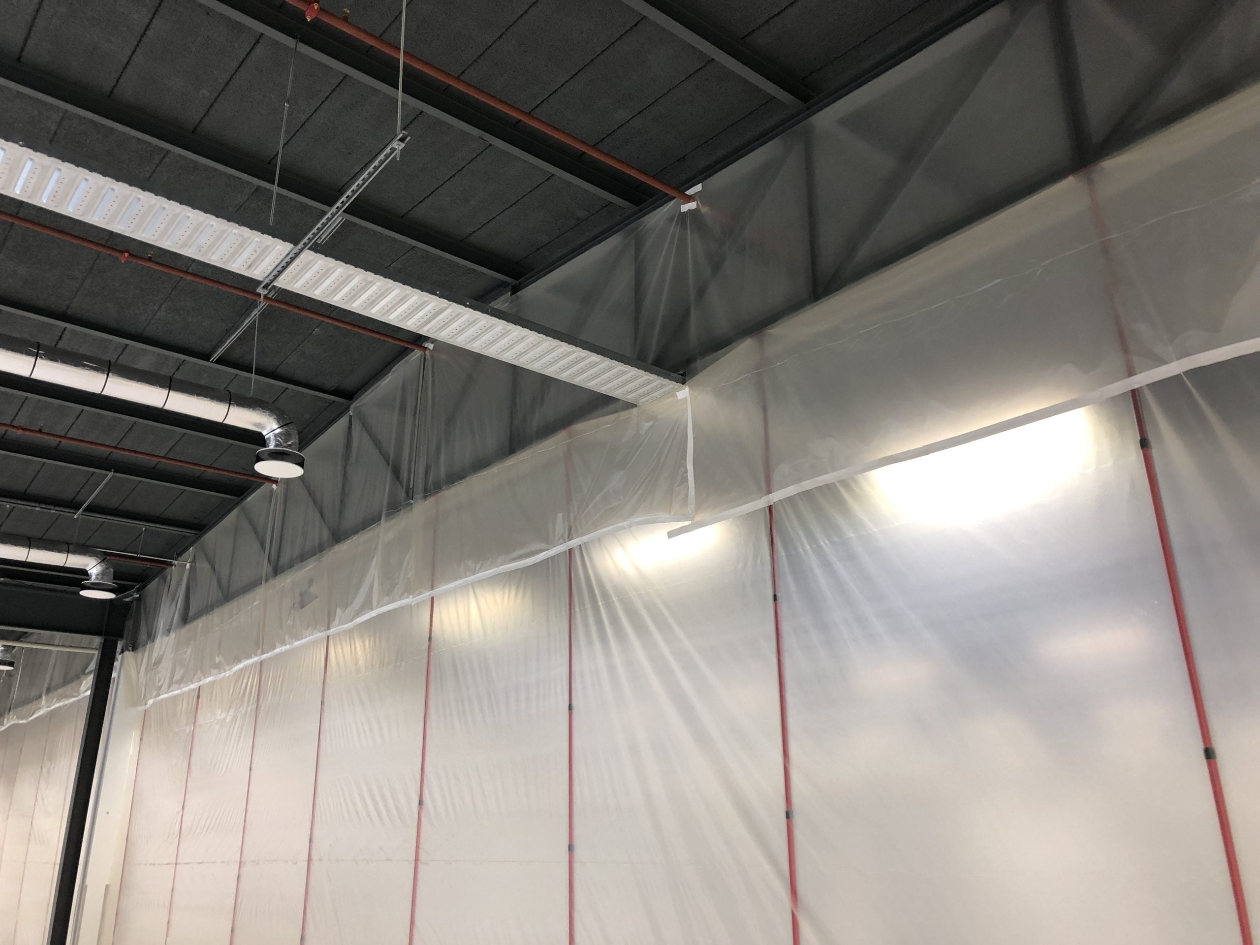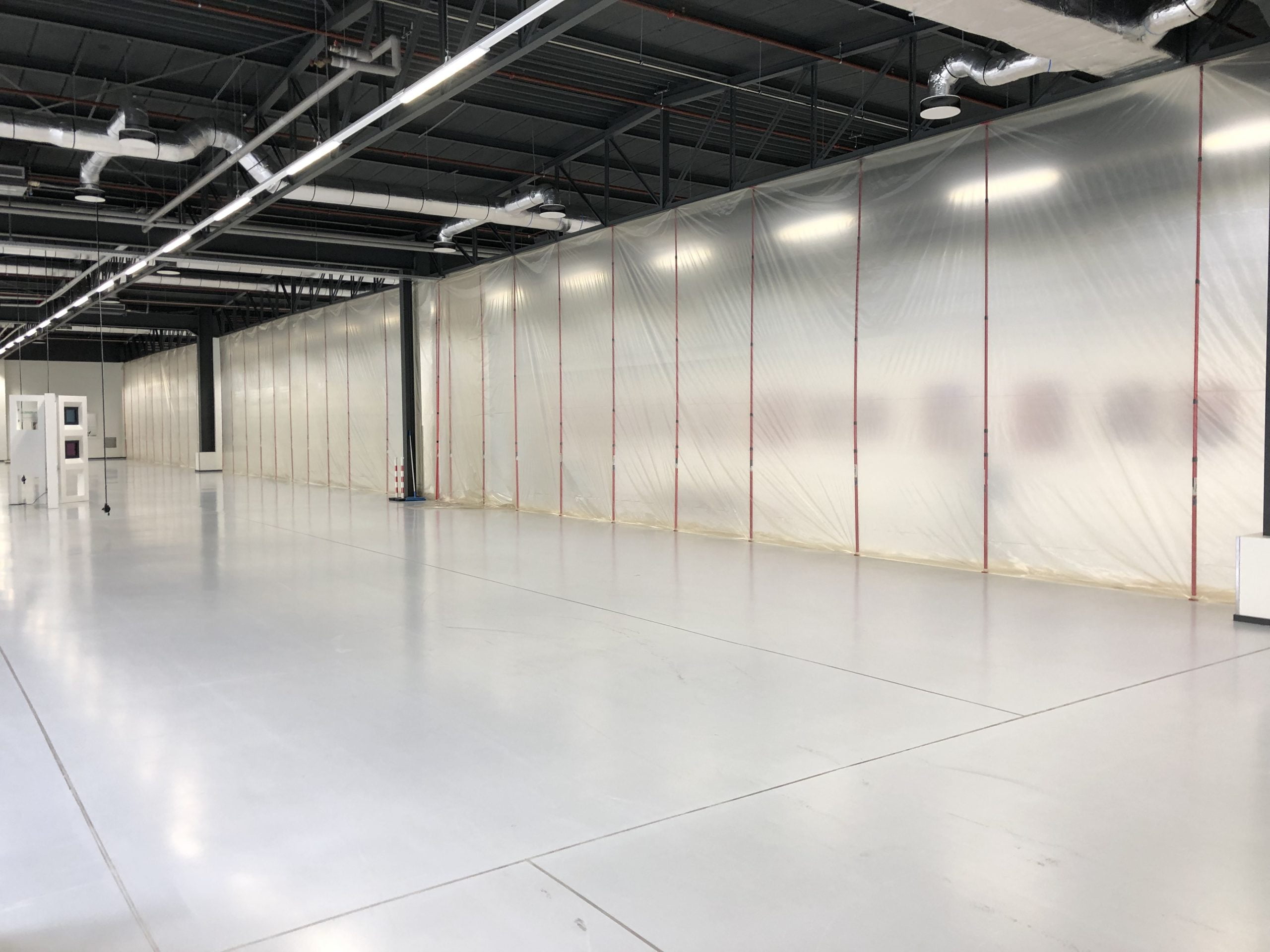 Für Merck Window Technologies aus Veldhoven haben wir eine Staubschutzwand mit einer Länge von 105 m in der Produktionshalle installiert. Während der Mietdauer wird eine neue Produktionslinie montiert, bei der Staub entstehen kann. Da in der Produktionshalle absolut kein Staub freigesetzt werden darf, wurde uns gebeten, eine temporäre Staubwand zu installieren. Mit unseren Staubwänden können wir eine maximale Höhe von 6 m abtrennen, aber da bei diesem Auftrag das Deckenlevel höher war und es Höhenunterschiede gab, haben wir die Staubwand unter den Sparren installiert. Den Raum oberhalb der Staubwand haben wir mit Folie abgedeckt, wobei wir die Rohrleitungen ausgeschnitten haben. Dadurch bleibt der während der Arbeiten entstehende Staub innerhalb des abgetrennten Bereichs. Die Staubwand wurde von SellcoRent einschließlich Montage und Demontage vermietet.