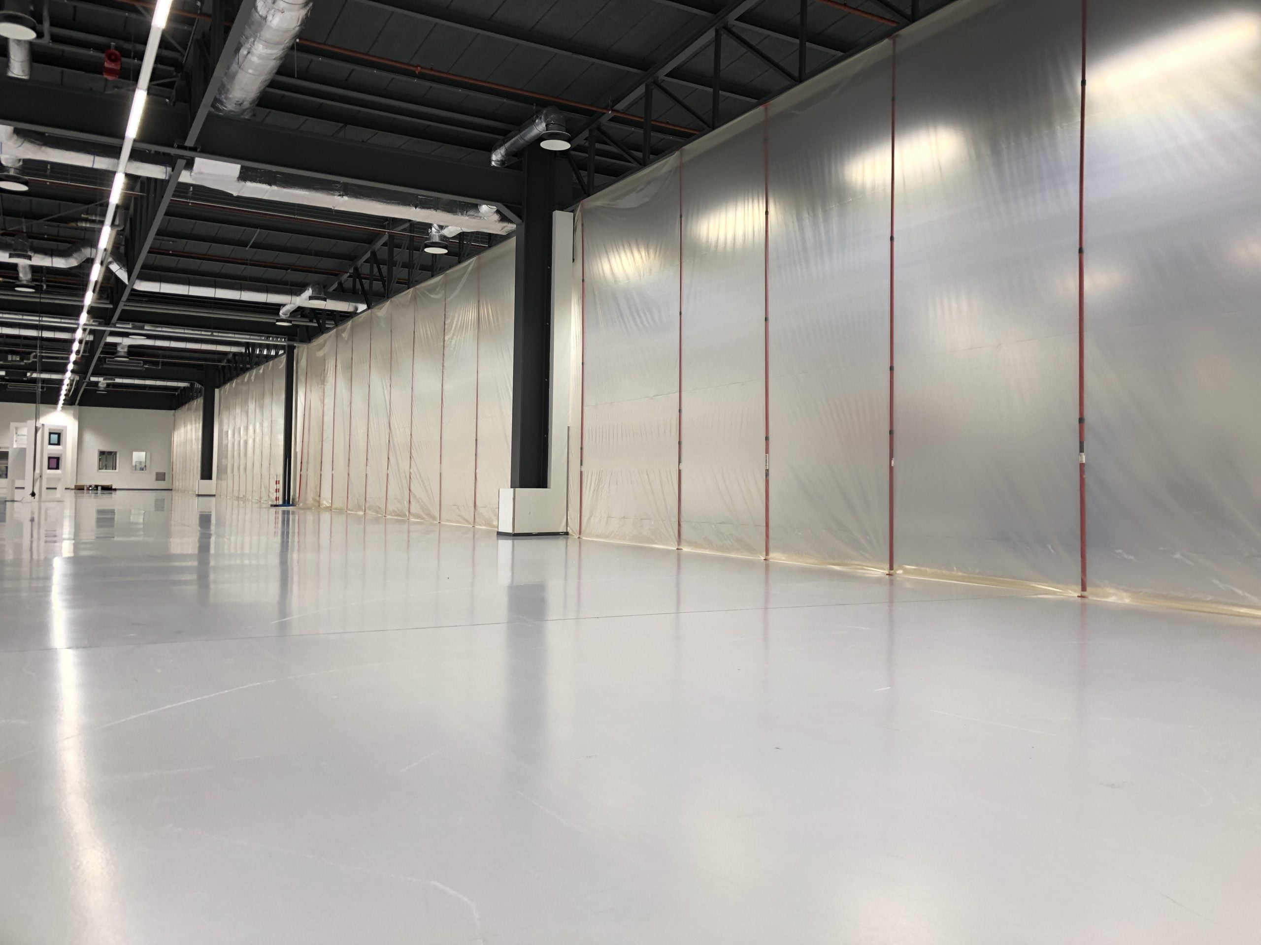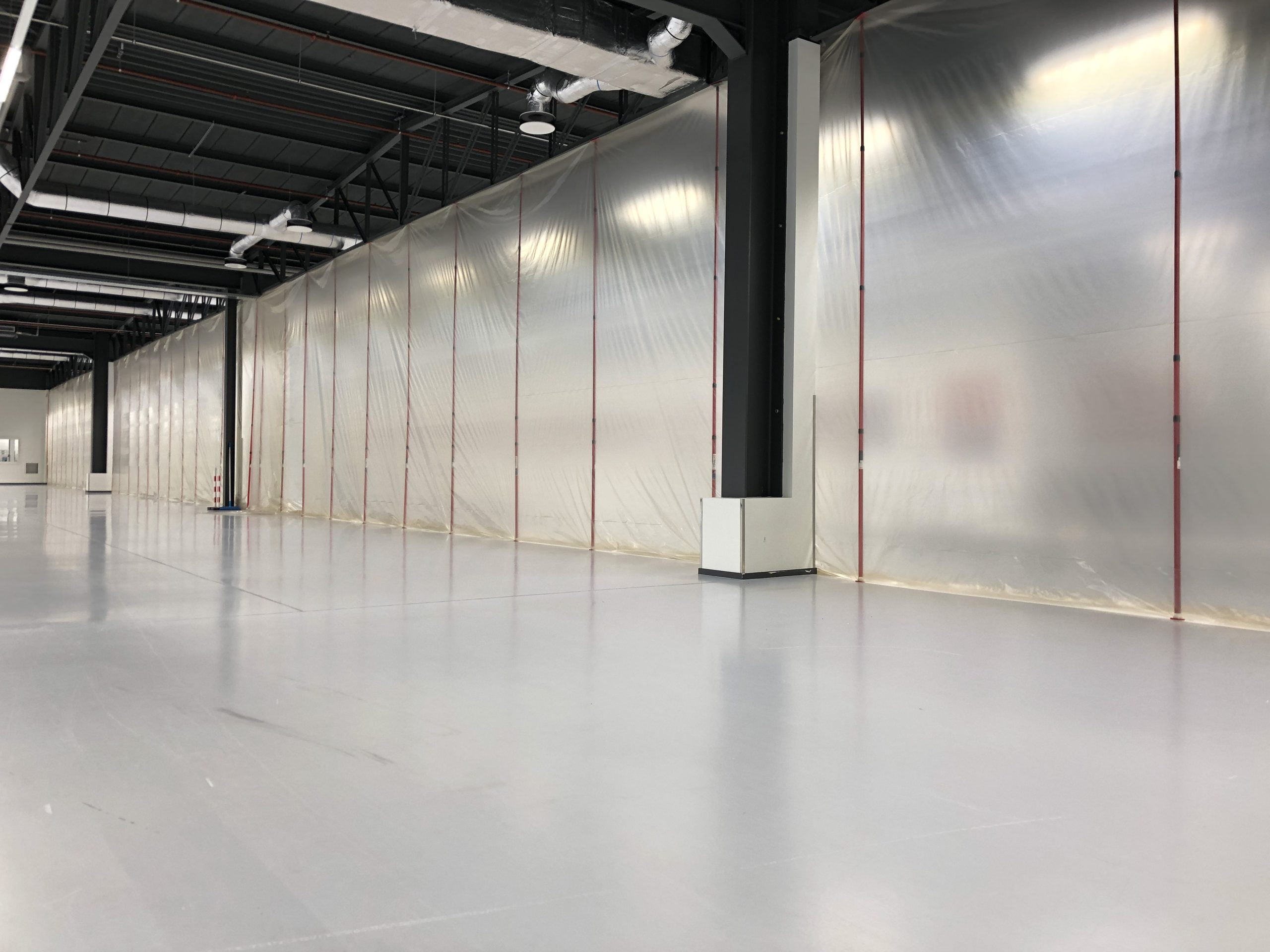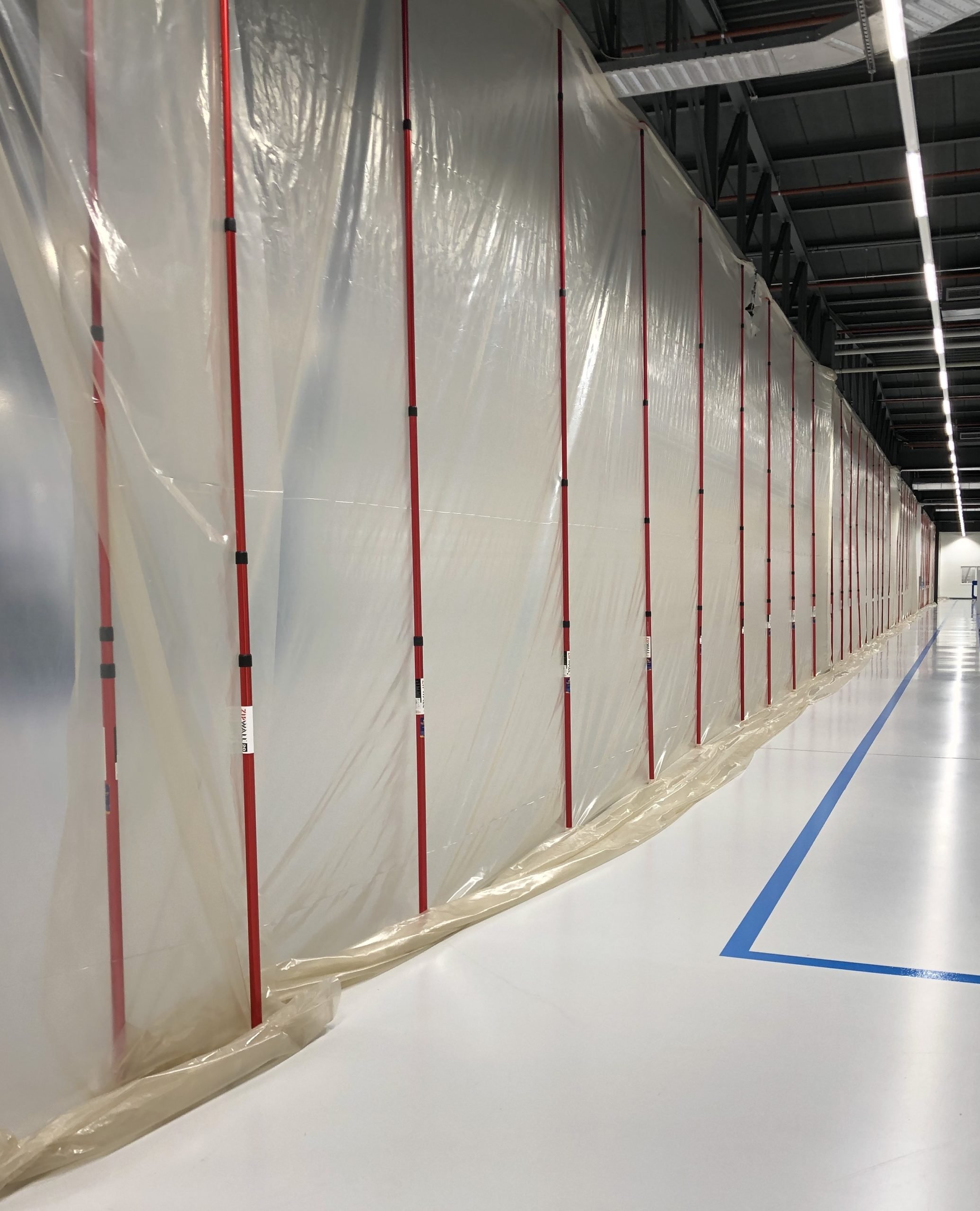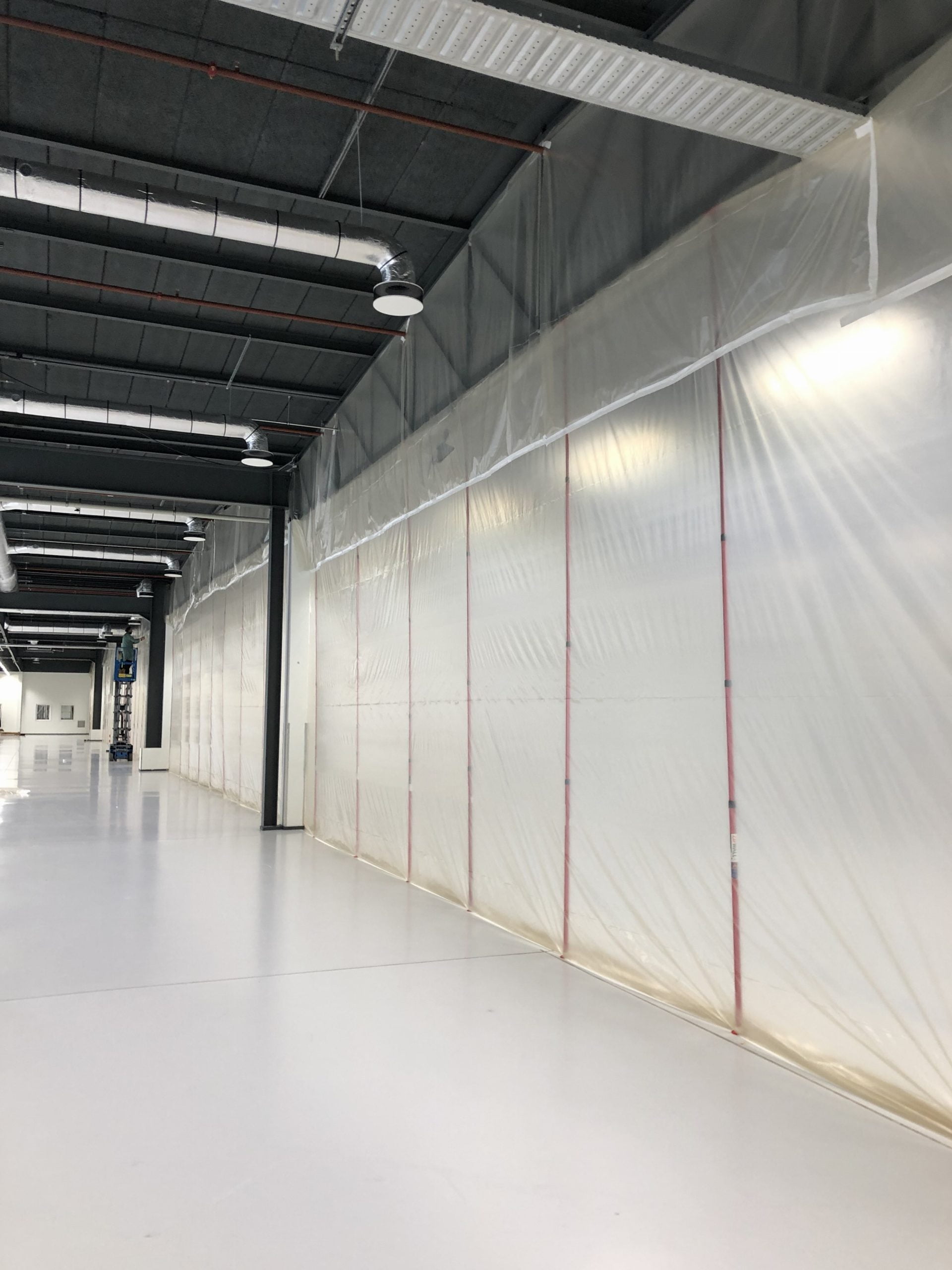 Für Merck Window Technologies aus Veldhoven haben wir eine Staubschutzwand mit einer Länge von 105 m in der Produktionshalle installiert. Während der Mietdauer wird eine neue Produktionslinie montiert, bei der Staub entstehen kann. Da in der Produktionshalle absolut kein Staub freigesetzt werden darf, wurde uns gebeten, eine temporäre Staubwand zu installieren. Mit unseren Staubwänden können wir eine maximale Höhe von 6 m abtrennen, aber da bei diesem Auftrag das Deckenlevel höher war und es Höhenunterschiede gab, haben wir die Staubwand unter den Sparren installiert. Den Raum oberhalb der Staubwand haben wir mit Folie abgedeckt, wobei wir die Rohrleitungen ausgeschnitten haben. Dadurch bleibt der während der Arbeiten entstehende Staub innerhalb des abgetrennten Bereichs. Die Staubwand wurde von SellcoRent einschließlich Montage und Demontage vermietet.