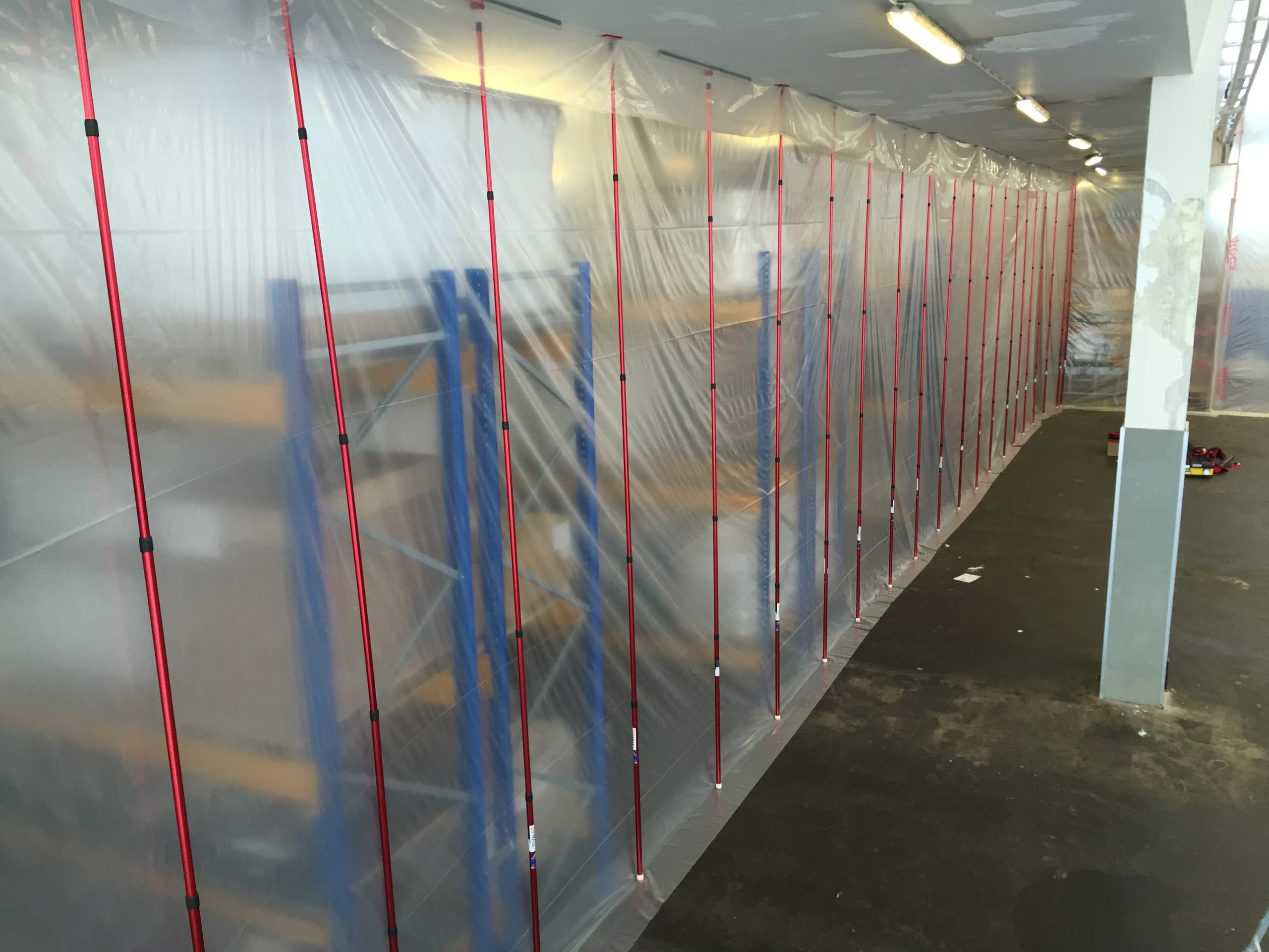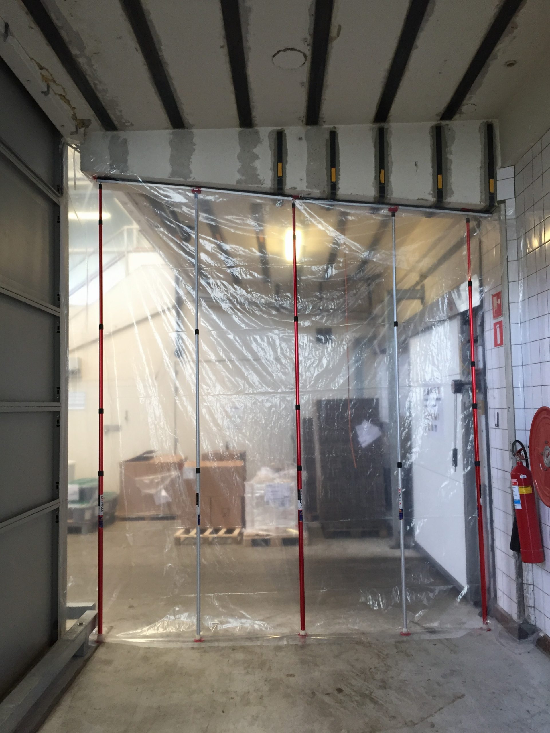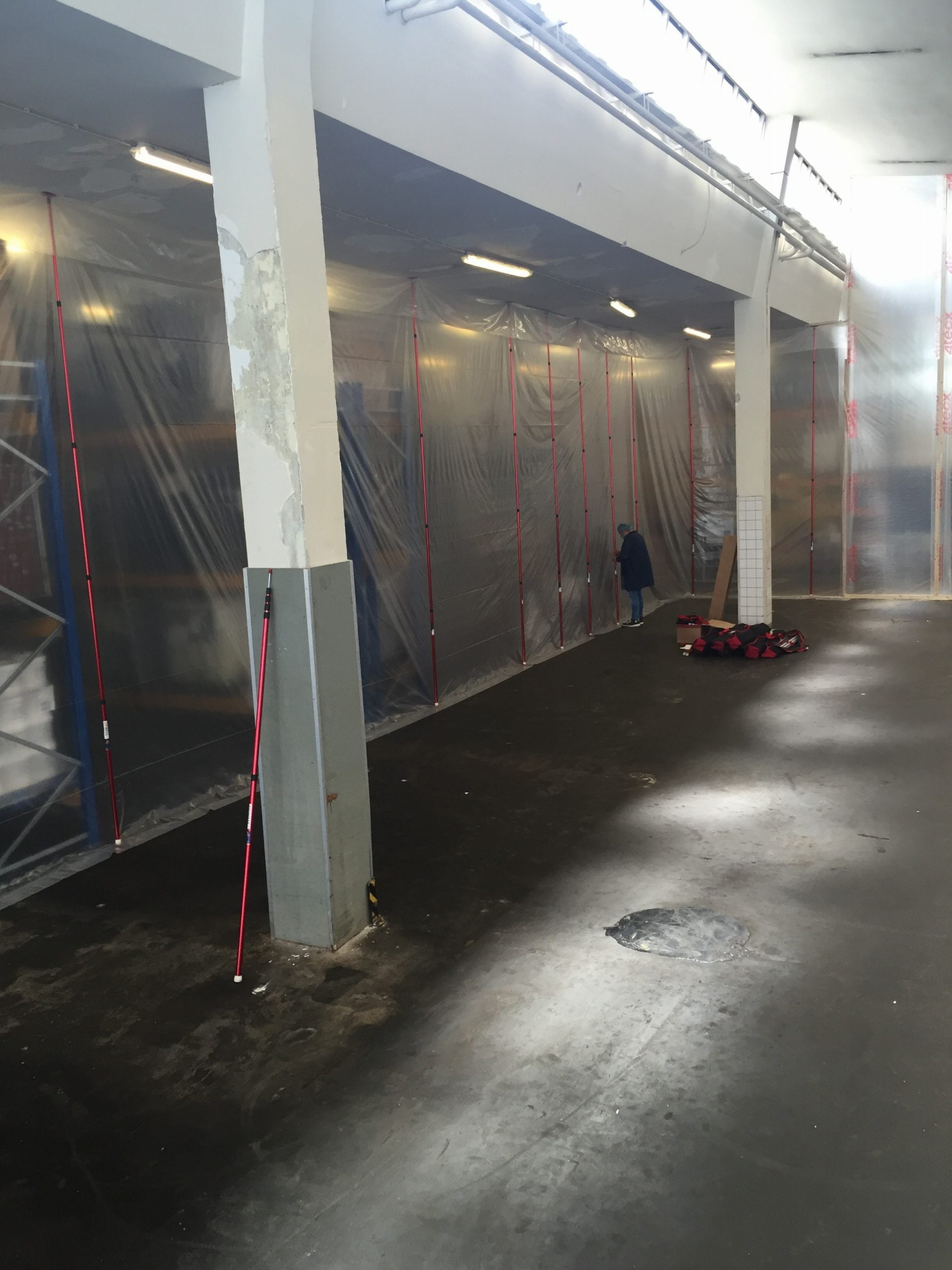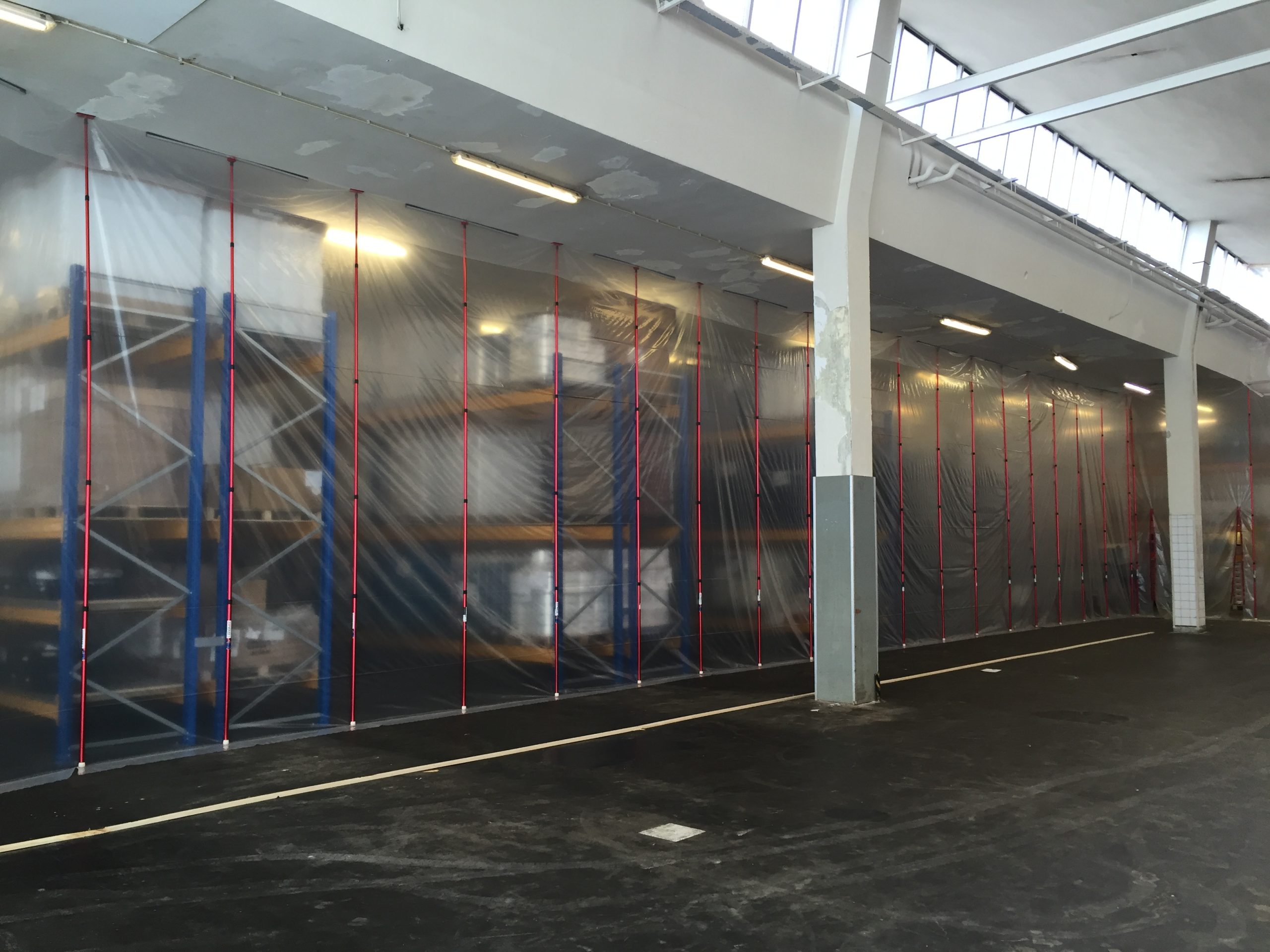 Aufgrund der hohen Decke im großen Raum haben wir die XXL-Teleskopstangen verwendet, mit denen wir Staubwände bis zu einer Höhe von 6,00 m installieren können. Da während der Renovierung Gabelstapler in den abgetrennten Bereich fahren müssen, haben wir die Öffnung mit speziellen selbstklebenden HD-Reißverschlüssen besonders breit und hoch gemacht.