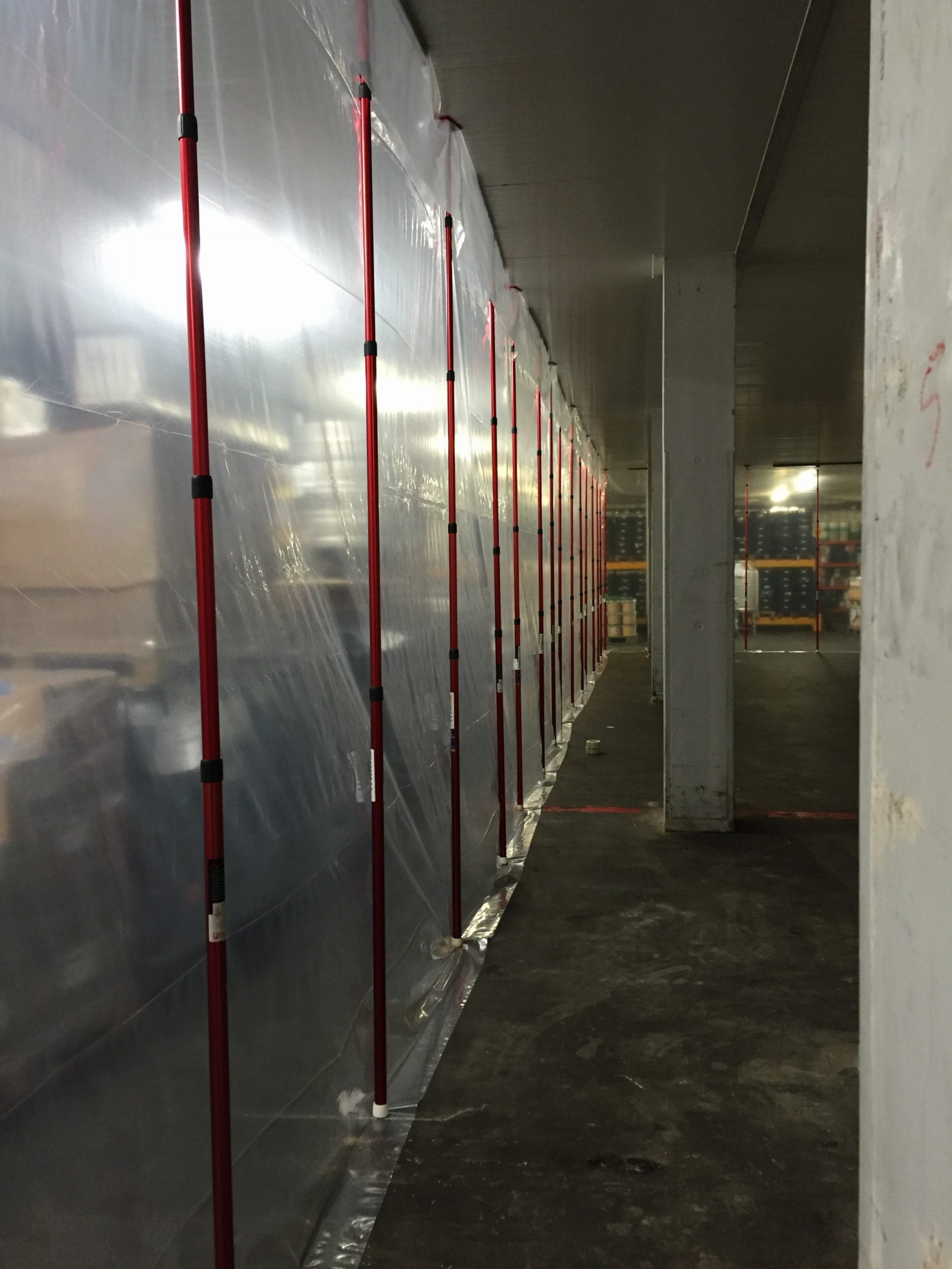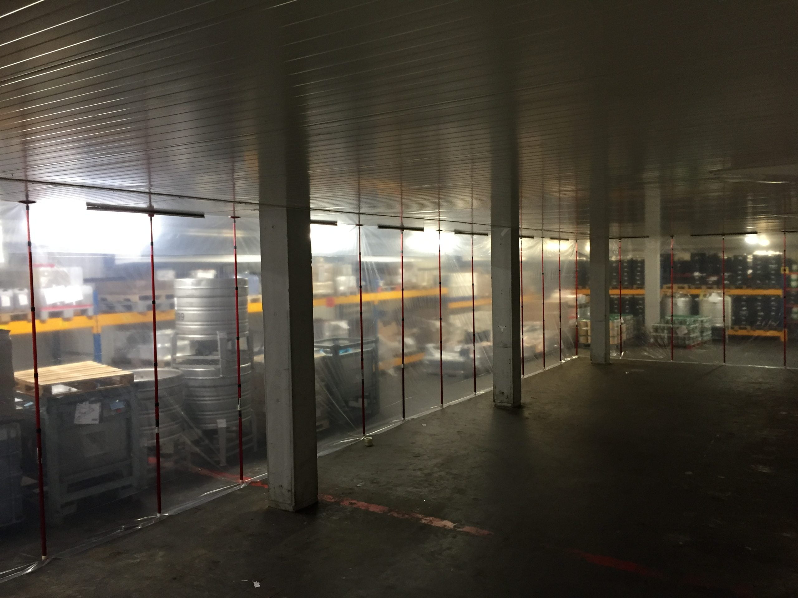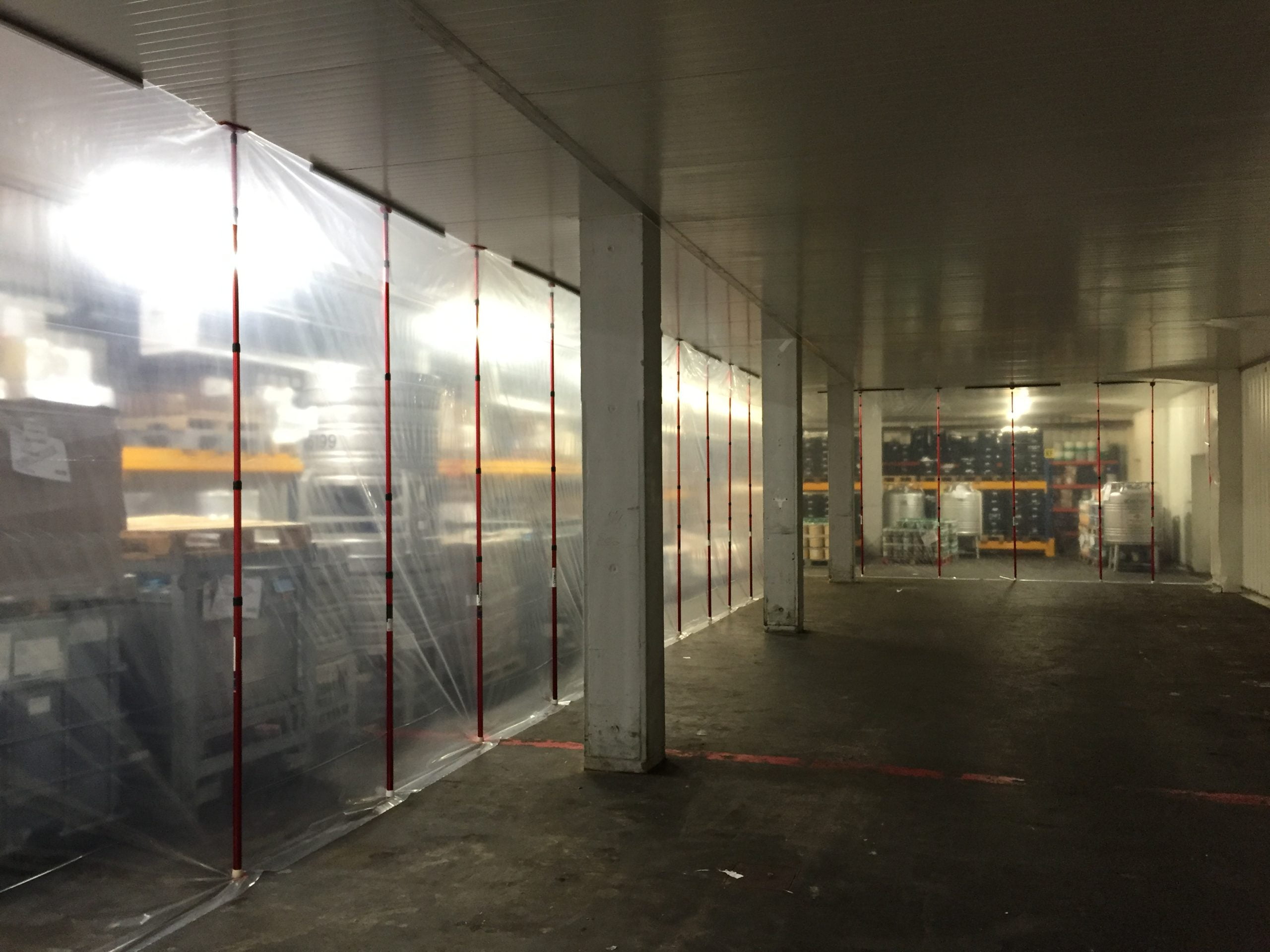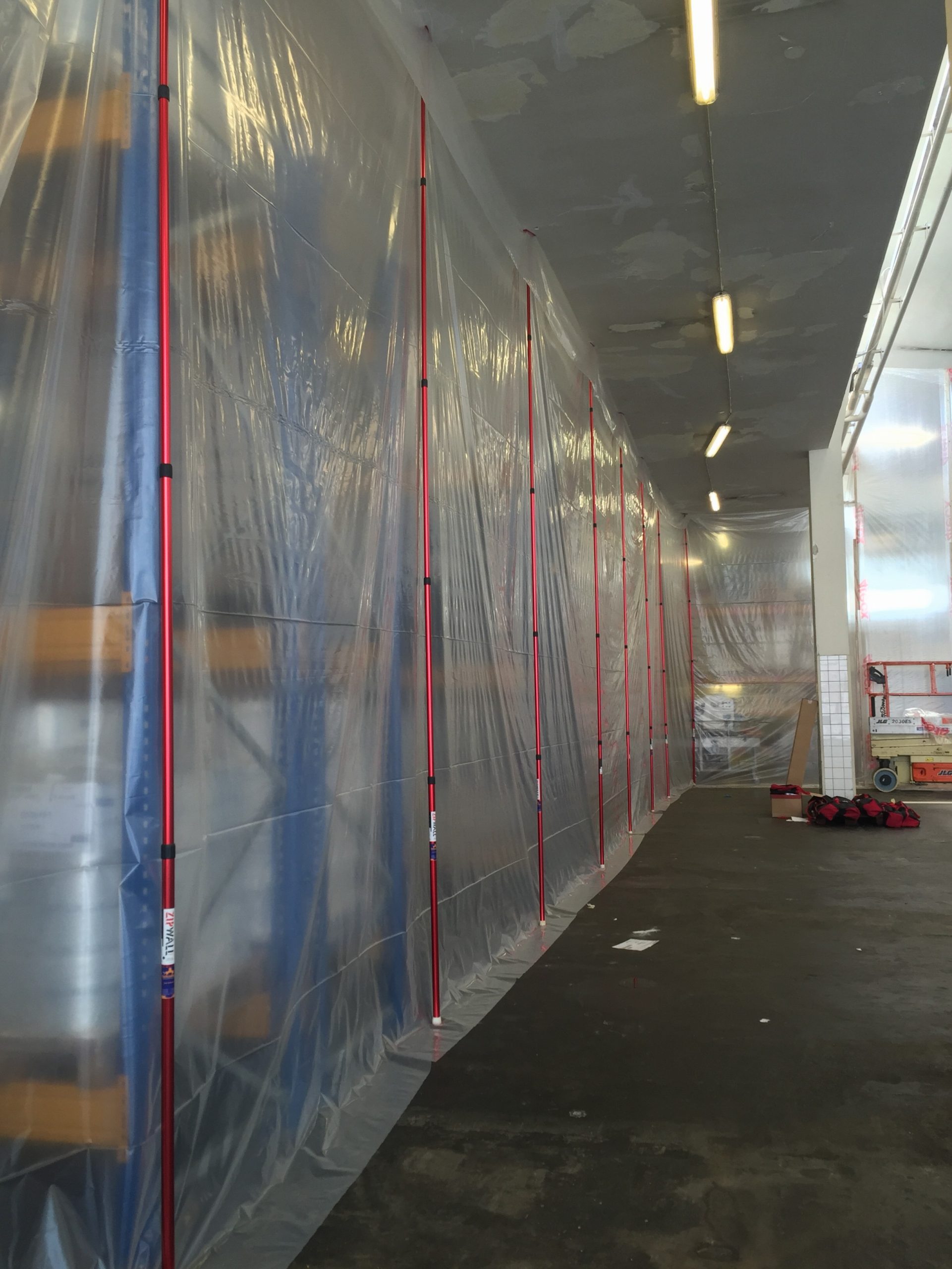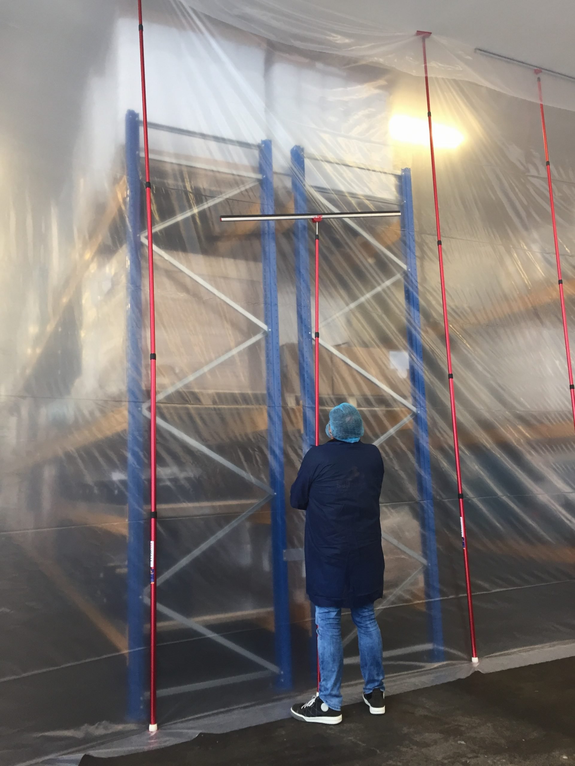 Aufgrund der hohen Decke im großen Raum haben wir die XXL-Teleskopstangen verwendet, mit denen wir Staubwände bis zu einer Höhe von 6,00 m installieren können. Da während der Renovierung Gabelstapler in den abgetrennten Bereich fahren müssen, haben wir die Öffnung mit speziellen selbstklebenden HD-Reißverschlüssen besonders breit und hoch gemacht.
